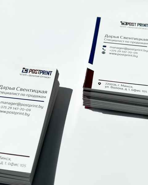 Полиграфический центр «Постпринт» представляет широчайший спектр услуг по разработке индивидуального дизайна визиток, созданию персональных проектов. Наш центр предоставляет услугу «печать визиток», Минск – один из городов, где можно сделать заказ. Они нужны для того, чтобы подчеркнуть высокий статус, оставить контактные данные, указать перечень услуг, которыми занимается конкретный человек. Если необходимо заказать визитки, обращайтесь в «Постпринт». Можем напечатать их любым тиражом. Дизайн создадим с учетом индивидуальных предпочтений.